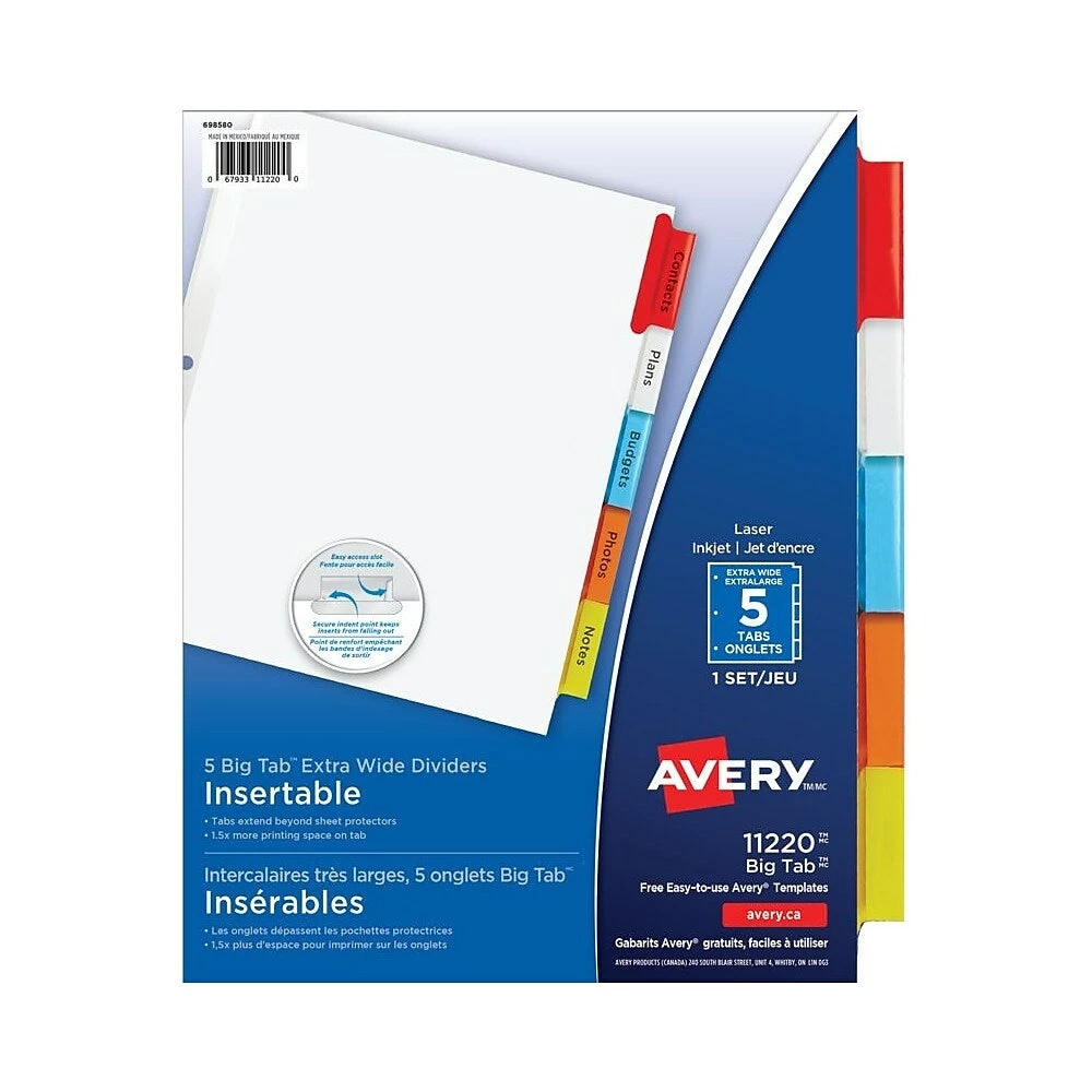 SKU: C3RHC 1687913165 Category: Office Tags: 3d_model_available:number:0, Apple_care:number:0, AverageOverallRating:number:5, Bc_l1_handle:office-supplies-189, Bc_l1_name:Office Supplies, Bc_l2_handle:office-210, Bc_l2_name:Office, Bc_l3_handle:binders-accessories-215, Bc_l3_name:Binders & Accessories, Bc_l4_handle:dividers-6749, Bc_l4_name:Dividers, Binder_colour_8683:Multicolour, Binders_and_accessories_l3_office_l2_office_supplies_l1|en_CA, Binders_custom_334800, Bopis_eligible:True, Brand:Avery, Bulk_buy:number:0, Busdep_class_id:775, Busdep_dropshop_return_co_loc:0, Busdep_primary_vendor_id:100951, Ca_max_quantity:number:0, Ca_min_quantity:number:0, Category_filter:Dividers, Category_name:Binders, Channel_availability:Both, Class_name:Dividers, Clearance_sku:number:0, Coming_soon:number:0, Consumable:number:0, Department:Binders, Dividers_l4_binders_and_accessories_l3_office_l2_office_supplies_l1|en_CA, Electronics_promotion_exclusion:number:0, En_CA, Exclusive:number:0, Export|en_CA, Free_shipping_flag:False, From_akeneo, Gift_with_purchase_gwp:number:0, In_FC:number:1, Made_in_canada:number:0, Metric1:number:12, Metric10:number:0, Metric2:number:0.101, Metric3:number:262, Metric4:number:16, Metric5:number:98, Metric6:number:0, Metric7:number:54, Metric8:number:0, Metric9:number:0, Model_num:11220, New_lower_price:number:0, Office_l2_office_supplies_l1|en_CA, Office_supplies_l1|en_CA, Preferred_max_quantity:number:0, Preferred_min_quantity:number:0, Preorder_flag:False, Product_type:Product, Promotion_Exclusion:False, Return_period:30 Days, Return_to_store:number:0, School_tools_item:number:0, Skuset:encoded:AveryExtra-WideBigTabInsertableDividers9x11, Super_category:Office Supplies, TotalSubmittedReviews:number:6, Upc_code:067933112200, Upsable:True, Web_status:Kiosk and Web