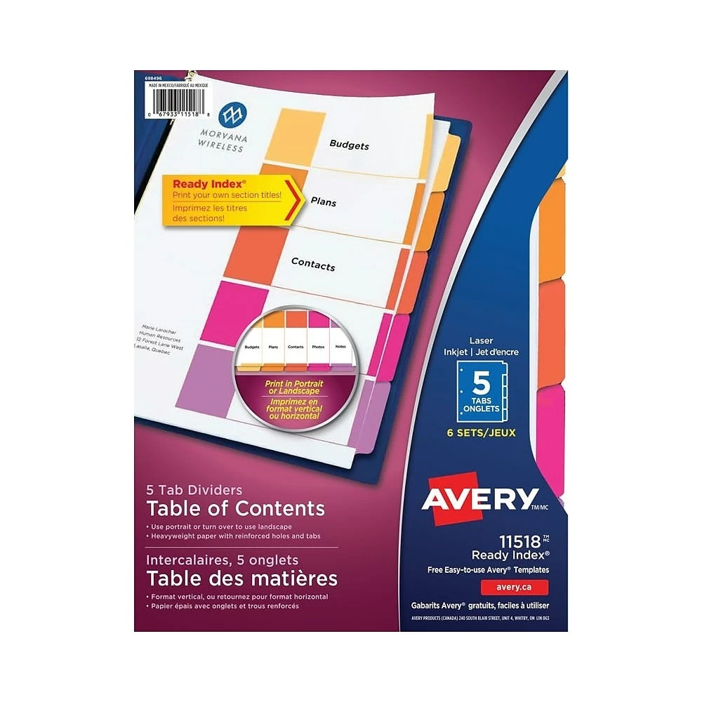 SKU: C3RHC 1687894836 Categories: Binders + Accessories, Office Tags: 3d_model_available:number:0, Apple_care:number:0, AverageOverallRating:number:0, Bc_l1_handle:office-supplies-189, Bc_l1_name:Office Supplies, Bc_l2_handle:office-210, Bc_l2_name:Office, Bc_l3_handle:binders-accessories-215, Bc_l3_name:Binders & Accessories, Bc_l4_handle:dividers-6749, Bc_l4_name:Dividers, Binder_colour_8683:Multicolour, Binders_and_accessories_l3_office_l2_office_supplies_l1|en_CA, Binders_custom_334800, Bopis_eligible:False, Brand:Avery, Bulk_buy:number:0, Busdep_class_id:775, Busdep_dropshop_return_co_loc:0, Busdep_primary_vendor_id:100951, Ca_max_quantity:number:0, Ca_min_quantity:number:0, Category_filter:Dividers, Category_name:Binders, Channel_availability:Both, Class_name:Dividers, Clearance_sku:number:0, Coming_soon:number:0, Consumable:number:0, Department:Binders, Dividers_l4_binders_and_accessories_l3_office_l2_office_supplies_l1|en_CA, Ecobenefit:20% post-consumer content, Electronics_promotion_exclusion:number:0, En_CA, Exclusive:number:0, Export|en_CA, Free_shipping_flag:False, From_akeneo, Gift_with_purchase_gwp:number:0, In_FC:number:1, Made_in_canada:number:0, Metric1:number:3, Metric10:number:0, Metric2:number:0.184, Metric3:number:72, Metric4:number:9, Metric5:number:31, Metric6:number:0, Metric7:number:4, Metric8:number:0, Metric9:number:0, Model_num:11518, New_lower_price:number:0, Office_l2_office_supplies_l1|en_CA, Office_supplies_l1|en_CA, Pack_size:6 Pack, Preferred_max_quantity:number:0, Preferred_min_quantity:number:0, Preorder_flag:False, Product_type:Product, Promotion_Exclusion:False, Return_period:30 Days, Return_to_store:number:0, School_tools_item:number:0, Skuset:encoded:AveryReadyIndexTableofContentsDividers115185-TabsSet, Super_category:Office Supplies, TotalSubmittedReviews:number:0, Upc_code:067933115188, Upsable:True, Web_status:Kiosk and Web