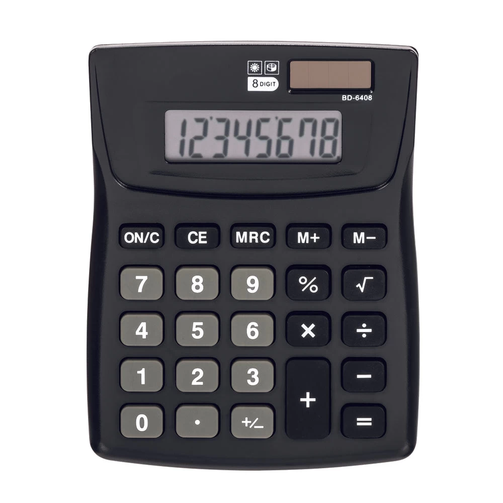 Ideal for home, office and school use, the Baseline BD-6408 8-Digit Desktop Calculator makes it easy to execute calculations. It features a full-function memory and has a large 8-digit LCD display that is easy to read and operate. The dual-powered calculator automatically switches from solar to battery power in low light. In addition to basic functions, it also offers memory, sign change and percent keys. This calculator is made from 85% post-consumer recycled content.