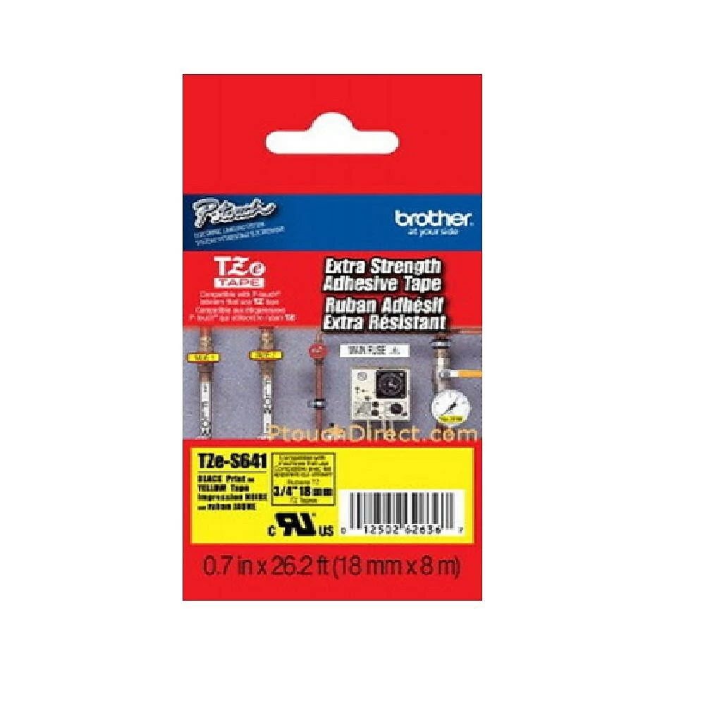 SKU: C3RHC 1687861782 Categories: Label Makers Tapes, Office Machines Tags: 3d_model_available:number:0, Apple_care:number:0, AverageOverallRating:number:0, Bc_l1_handle:ink-office-machines-6, Bc_l1_name:Ink & Office Machines, Bc_l2_handle:office-machines-26, Bc_l2_name:Office Machines, Bc_l3_handle:label-makers-tapes-8536, Bc_l3_name:Label Makers & Tapes, Bc_l4_handle:label-maker-tapes-8538, Bc_l4_name:Label Maker Tapes, Bopis_eligible:False, Brand:Brother, Bulk_buy:number:0, Busdep_class_id:216, Busdep_dropshop_return_co_loc:RV000, Busdep_primary_vendor_id:120441, Ca_max_quantity:number:0, Ca_min_quantity:number:0, Category_filter:Label Maker Tapes, Category_name:Label Makers/Printers, Channel_availability:Both, Class_name:Label Printer Labels & Tapes, Clearance_sku:number:0, Colour_coding_id_labels_334106, Coming_soon:number:0, Consumable:number:0, Department:Label Printer Labels, Electronics_promotion_exclusion:number:0, En_CA, Exclusive:number:0, Export|en_CA, Free_shipping_flag:False, From_akeneo, Gift_with_purchase_gwp:number:0, In_FC:number:0, Ink_and_office_machines_l1|en_CA, Label_maker_tapes_l4_label_makers_tapes_l3_office_machines_l2_ink_office_machines_l1|en_CA, Label_makers_tapes_l3_office_machines_l2_ink_office_machines_l1|en_CA, Made_in_canada:number:0, Metric1:number:0, Metric10:number:0, Metric2:number:0.063, Metric3:number:0, Metric4:number:1, Metric5:number:13, Metric6:number:0, Metric7:number:0, Metric8:number:0, Metric9:number:0, Model_num:TZES641, New_lower_price:number:0, Office_machines_l2_ink_and_office_machines_l1|en_CA, Pack_size:Each, Preferred_max_quantity:number:0, Preferred_min_quantity:number:0, Preorder_flag:False, Product_type:Product, Promotion_Exclusion:False, Return_period:30 Days, Return_to_store:number:0, School_tools_item:number:0, Skuset:encoded:Brother18mmBlackonYellowtapewithExtraStrengthAdhesive8mTZeS641, Super_category:Shredders / Business Machines, TotalSubmittedReviews:number:0, Upc_code:012502606895, Upsable:True, Web_status:Kiosk and Web