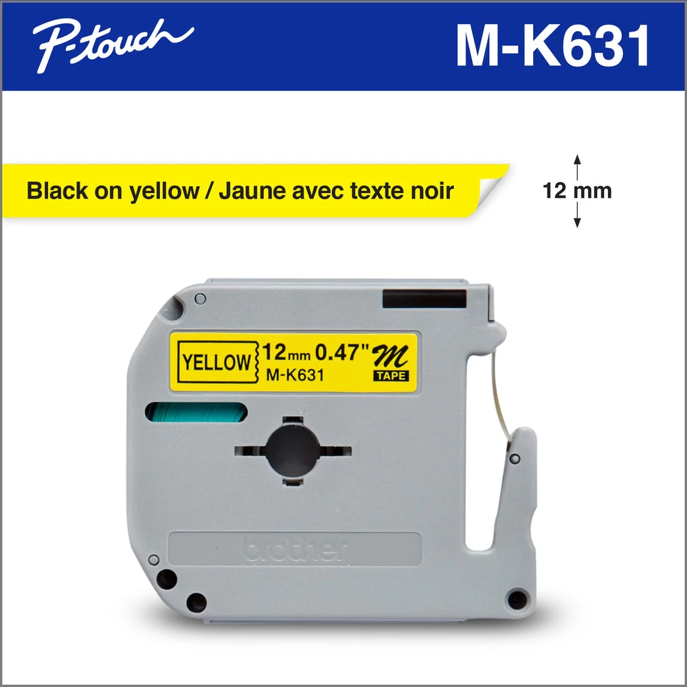 MK631 P-touch M Series non-laminated tape uses thermal transfer technology to print yellow labels with crisp black text that are ideal for use on flat, dry, indoor surfaces in home, home office, school or hobby labelling applications.