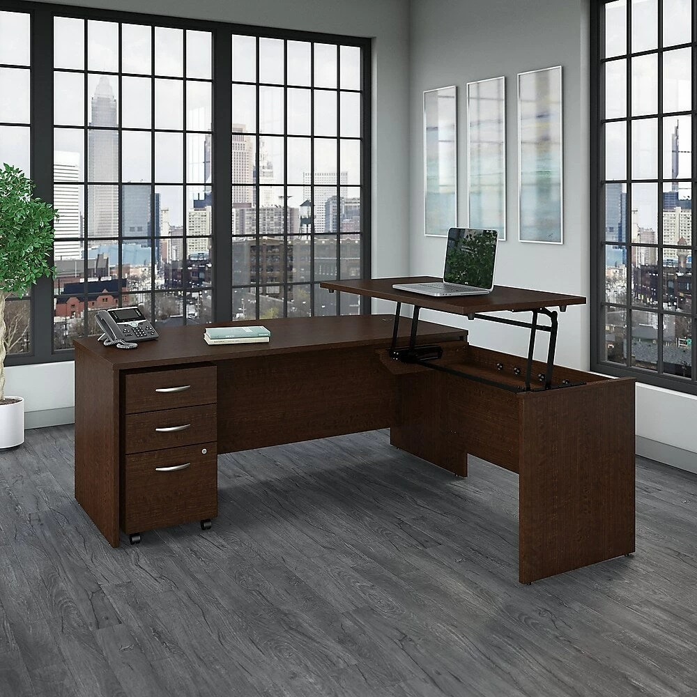 Bush Business Furniture Westfield 72W X 36D 3 Position Bow Front Sit To Stand L Desk W/ File Cabinet, Mocha Cherry (SRC126MRSU)