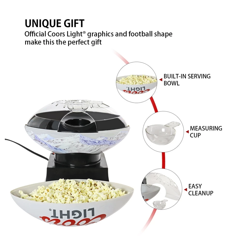 This fun and functional Coors Light popcorn maker will be the most unique and handy accessory in your rec room or home bar. Make bowl after bowl of perfectly fluffy popcorn in minutes with no oil and no mess in this unique football-themed air popper. The handy kernel measuring cup even doubles as a butter melter while your popcorn is popping and is dishwasher friendly for easy cleanup.