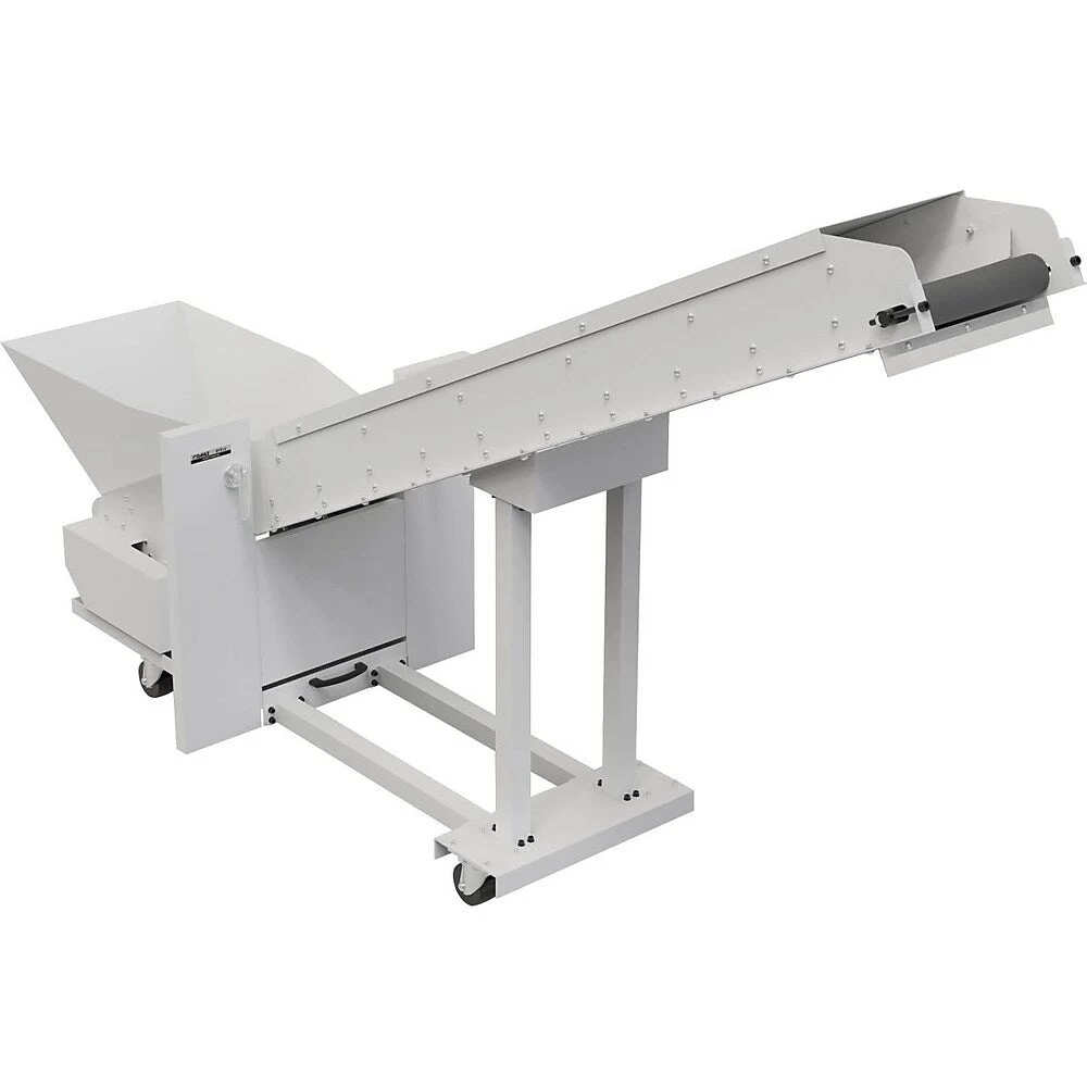 The PowerTEC 919 CB is a high capacity output conveyor for delivering shredded waste to a large recycling bin or baler. The conveyor plugs directly into the PowerTEC 919 IS Industrial Shredder and easily locks in place.