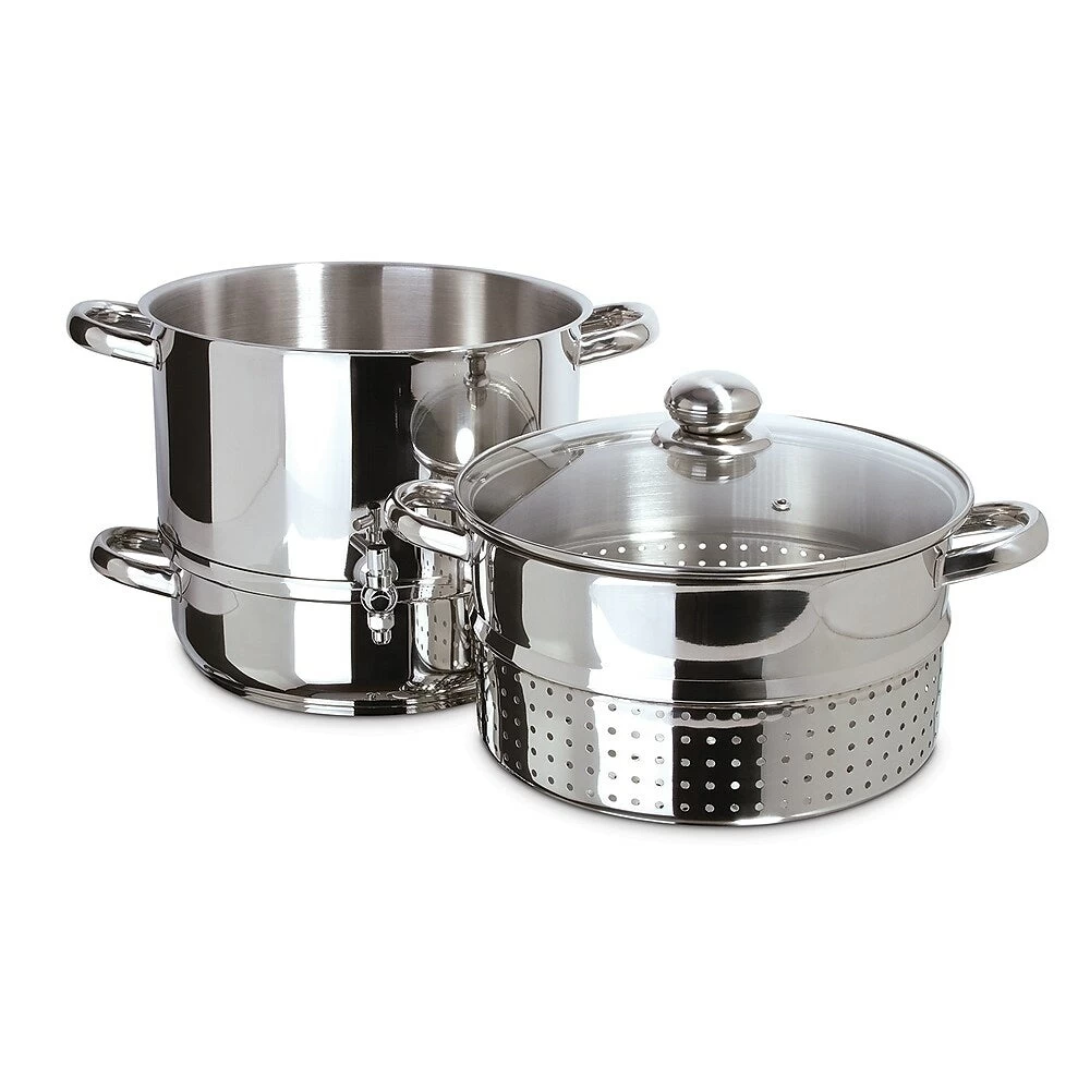 The Euro Cuisine Stainless Steel Steam Juicer, with our specially designed spigot, will extract 100% pure and delicious juice with the power of steam from all sorts of fruits and vegetable. All the juicing is done right on your stove top. To extract a high-volume of juice – just add fresh fruit or vegetables into the steamer basket, fill the water reservoir with water, and gently bring the water to a boil on your stovetop. The steam process will open the juice cells in the fruit and extract juice, which will drip into the juice container with spigot. Once the juice is ready, use the spigot to drain the juice from the juice container into bottles or jars. Enjoy drinking the vitamin-rich juice fresh, or save it for making jelly and syrup.