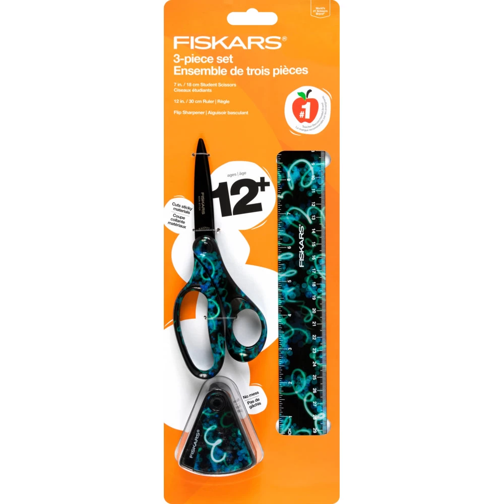 Fiskars 3-Piece Student Deco Set – 7″ Scissors – Ruler – Sharpener