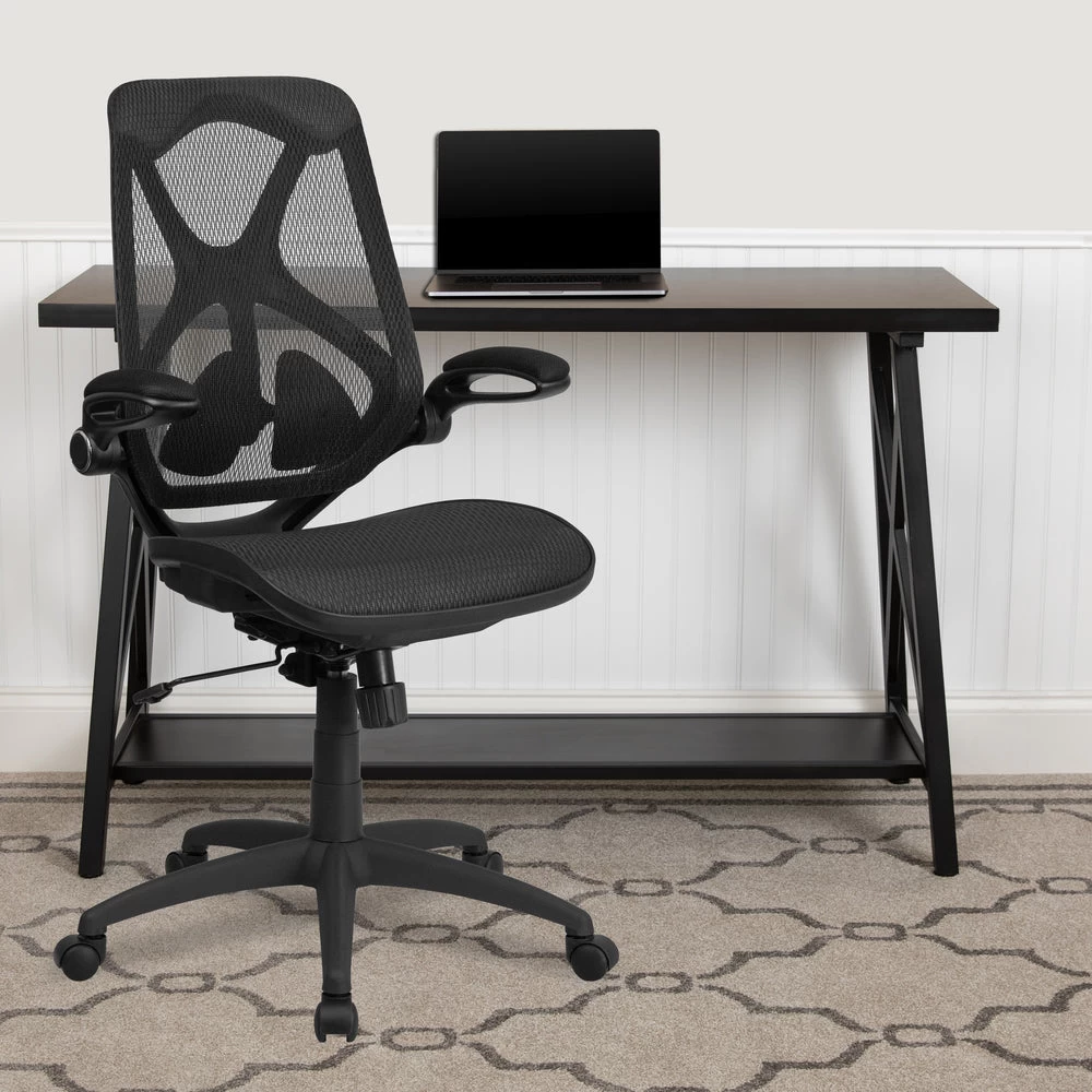 Relax in this cozy office chair with double paddle controls. This chair features transparent, breathable mesh material that allows air to circulate. Mesh office chairs can keep you more productive throughout your work day with its comfort and ventilated design. The breathable mesh material allows air to circulate to keep you cool while sitting. Finding a comfortable chair is essential when sitting for long periods at a time. The high back design relieves tension in the lower back, preventing long term strain. The synchro tilt control allows the chair’s back and seat to recline at different rates, increasing the angle between your torso and thighs. The adjustable lumbar support will provide superior support to a larger range of area. The waterfall front seat edge removes pressure from the lower legs and improves circulation. Chair easily swivels 360 degrees to get the maximum use of your workspace without strain. The pneumatic adjustment lever will allow you to easily adjust the seat to your desired height. The flip-up arms are great for users who like the option of an armless chair without the hassle of detaching them.