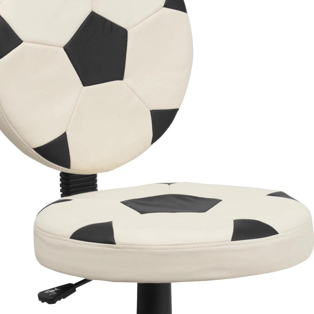 Bring your favorite sport to the desk with this Soccer Inspired Office Chair that is perfect for all young soccer fans! The round seat and back resembles two soccer balls that are upholstered in vinyl material for easy cleaning. This chair was designed to support the lower-to-mid back region. Chair easily swivels 360 degrees to get the maximum use of your workspace without strain. The pneumatic adjustment lever will allow you to easily adjust the seat to your desired height. With an affordable price tag it is sure to please the young soccer fan in your home.