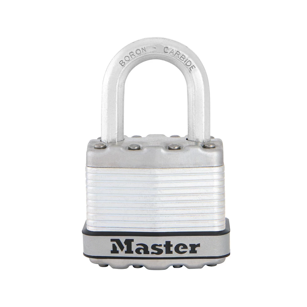 The Master Lock Magnum No. M1XD Laminated Padlock features a 1-3/4in (44mm) wide laminated steel body for maximum strength and reliability, and is surrounded by stainless steel and zinc outer components for weather resistance. The 5/16in (8mm) diameter octagonal shackle is 1in (25mm) long and made of Tough-Cut™ boron-carbide, 50% harder than hardened steel, offering maximum resistance to cutting and sawing. The 4-pin cylinder prevents picking and the dual locking ball bearings provide maximum resistance against prying and hammering.