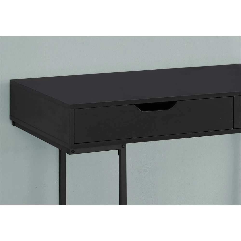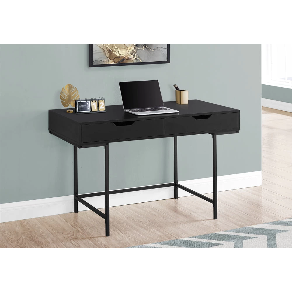 A stylish study in contrasts, this streamlined computer desk will add style to any room. Finished in a smooth, black laminate, the desktop has a substantial appearance thanks to an ample work surface and built-in drawers. The 2 storage drawers are wide and deep, offering room for supplies like writing materials and even letter- and legal-size papers. Supporting the top is a sturdy base in a matching black finish with slender metal legs that are recessed for a striking look. With its clean design and compact size, this modern laptop desk is ideal for smaller home offices and is attractive enough to also serve as an accent table.