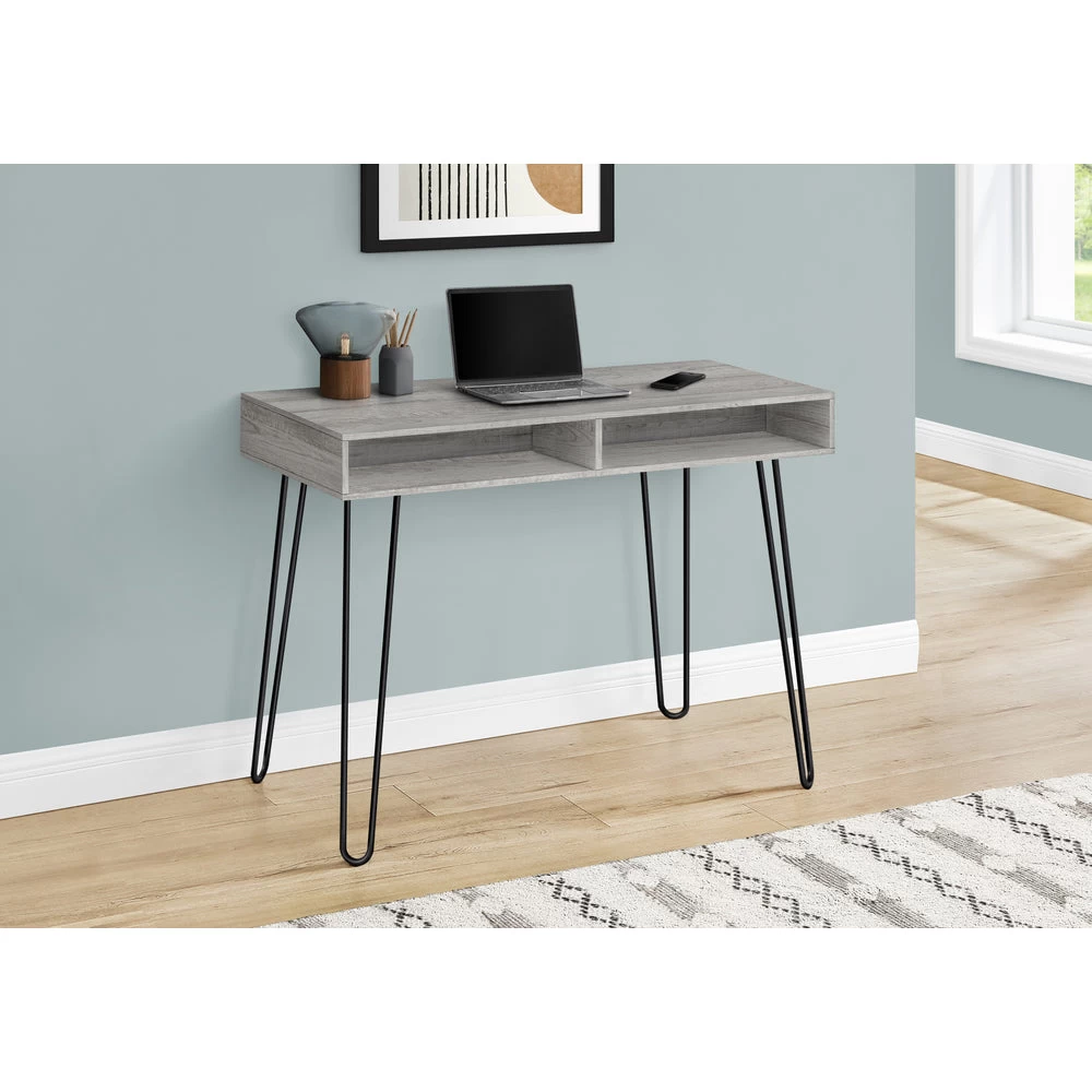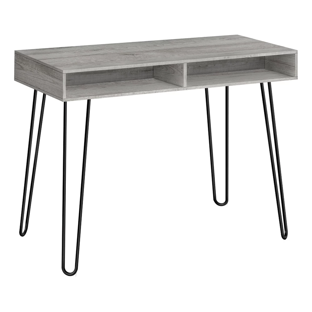 Bring mid-century style to your workspace with this computer desk with storage. This desk features a grey wood-look laminate finish paired with contrasting black metal hairpin legs for an elegant, retro style. The minimalistic design makes this writing desk a perfect addition to your dorm room or small apartment. The desktop is large enough for you to finish homework or browse social media on your laptop. The 2 open cubbies allow you to store notebooks, writing utensils, keeping your workspace clutter-free.