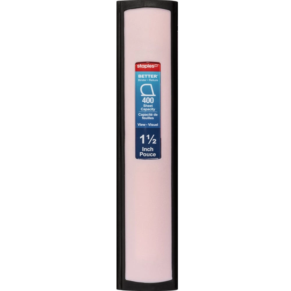 SKU: C3RHC 1687894404 Categories: Binders + Accessories, Office Tags: 3d_model_available:number:0, Apple_care:number:0, AverageOverallRating:number:4.5410, Bc_l1_handle:office-supplies-189, Bc_l1_name:Office Supplies, Bc_l2_handle:office-210, Bc_l2_name:Office, Bc_l3_handle:binders-accessories-215, Bc_l3_name:Binders & Accessories, Bc_l4_handle:binders-6747, Bc_l4_name:Binders, Binder_colour_8683:Pastel, Binder_deals|en_CA, Binder_durability_8682:Heavy-Duty, Binder_pack_size_901079:Each, Binder_pvc_free_17018:No, Binder_ring_size_8513:1-1/2", Binder_ring_type_8133:Slant D-Ring, Binder_size_8681:encoded:8-12x11Letter, Binder_type_8132:View, Binders_and_accessories_l3_office_l2_office_supplies_l1|en_CA, Binders_and_dividers|en_CA, Binders_custom_334800, Binders_l4_binders_and_accessories_l3_office_l2_office_supplies_l1|en_CA, Black_friday_in_july|en_CA, Bopis_eligible:True, Brand:Staples, Bulk_buy:number:0, Busdep_class_id:768, Busdep_dropshop_return_co_loc:0, Busdep_primary_vendor_id:104441, Ca_max_quantity:number:0, Ca_min_quantity:number:0, Category_filter:Binders, Category_name:Binders, Channel_availability:Both, Class_name:Binders, Clearance_sku:number:0, Coming_soon:number:0, Consumable:number:0, Department:Binders, Electronics_promotion_exclusion:number:0, En_CA, Exclusive:number:1, Export|en_CA, From_akeneo, Gift_with_purchase_gwp:number:0, In_FC:number:1, Made_in_canada:number:0, Metric1:number:17, Metric10:number:0, Metric2:number:0.313, Metric3:number:233, Metric4:number:133, Metric5:number:1322, Metric6:number:0, Metric7:number:18, Metric8:number:0, Metric9:number:0, Model_num:ST61280-CA, New_lower_price:number:0, Office_l2_office_supplies_l1|en_CA, Office_supplies_l1|en_CA, Pack_size:Each, Pep_rally_brand_page|en_CA, Preferred_max_quantity:number:0, Preferred_min_quantity:number:0, Preorder_flag:False, Primary_badge:Exclusive, Product_model_code:staples_better_binders, Product_type:Product, Promotion_Exclusion:False, Return_period:30 Days, Return_to_store:number:0, School_tools_item:number:0, Site_merch_ops|en_CA, Skuset:encoded:PepRallyBetterBinder1.5Pink, Spine_label:True, Staples_better_binders, Super_category:Office Supplies, TotalSubmittedReviews:number:5601, Upc_code:718103427371, Upsable:True, Web_status:Kiosk and Web