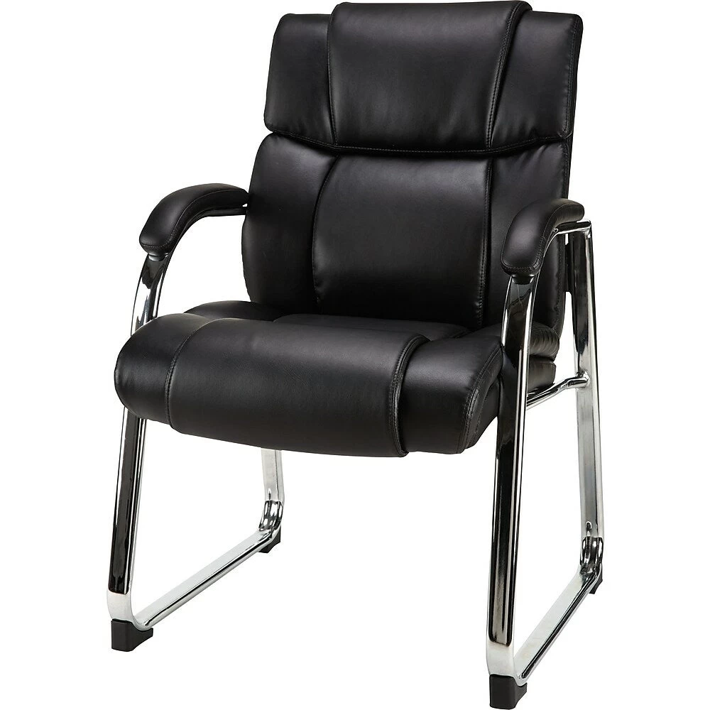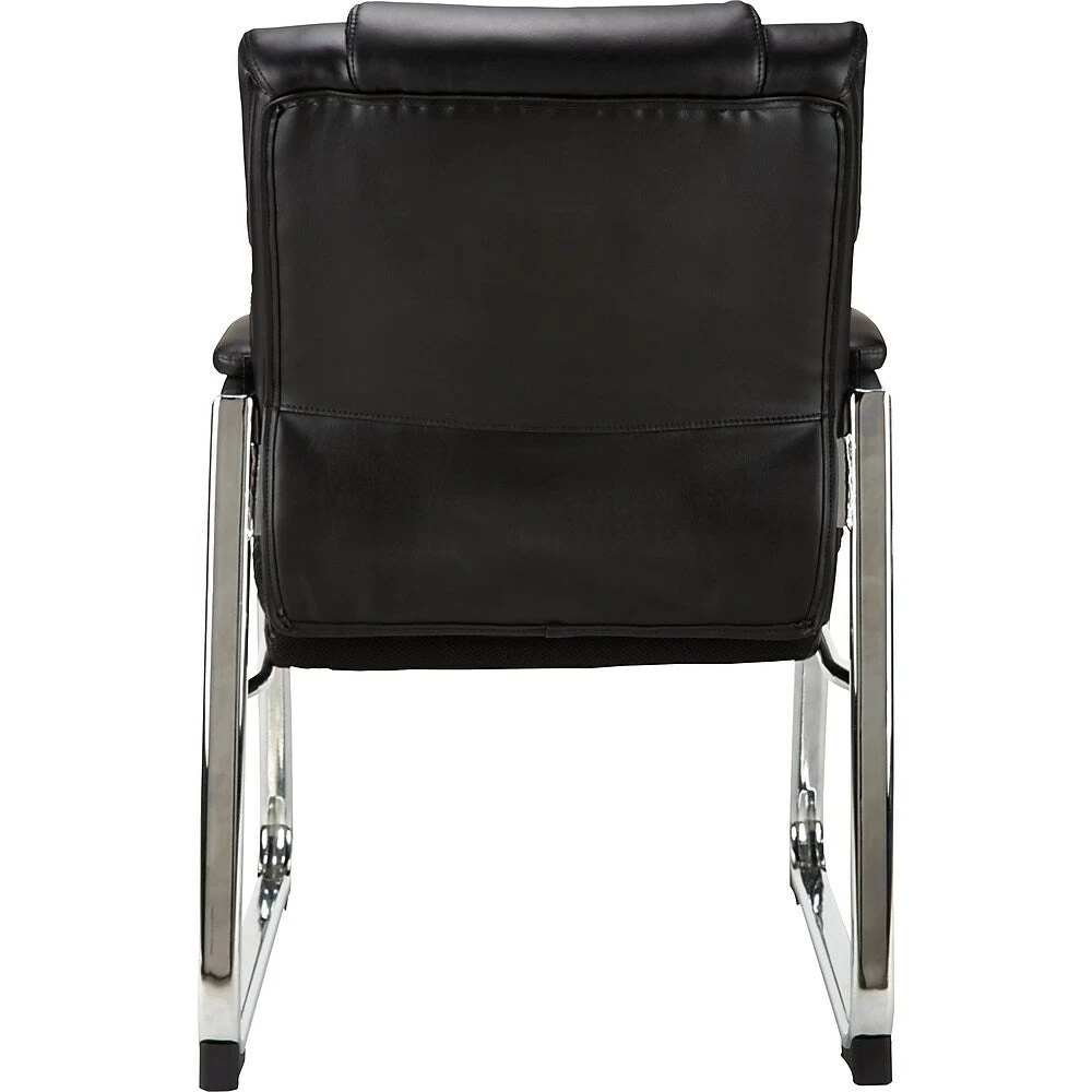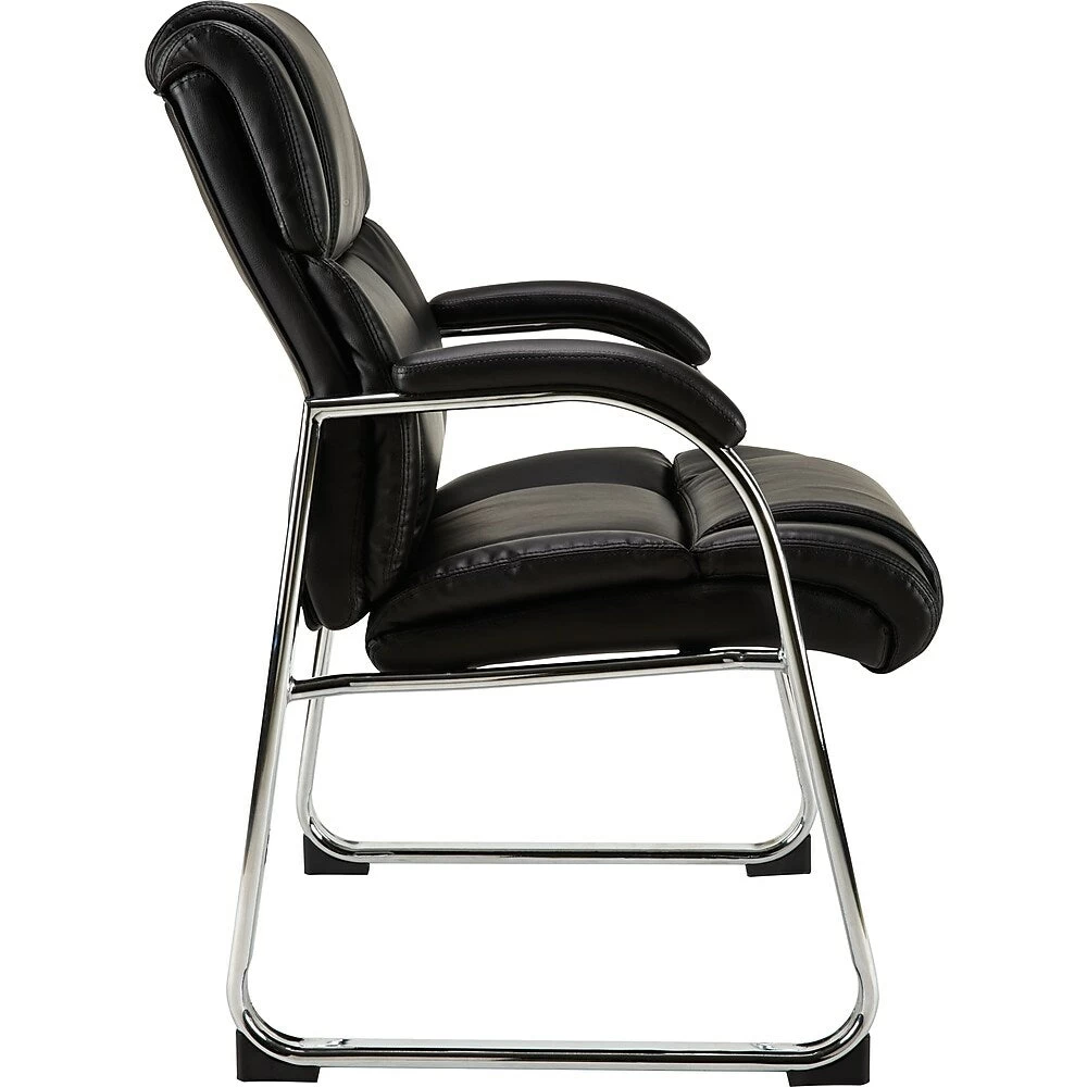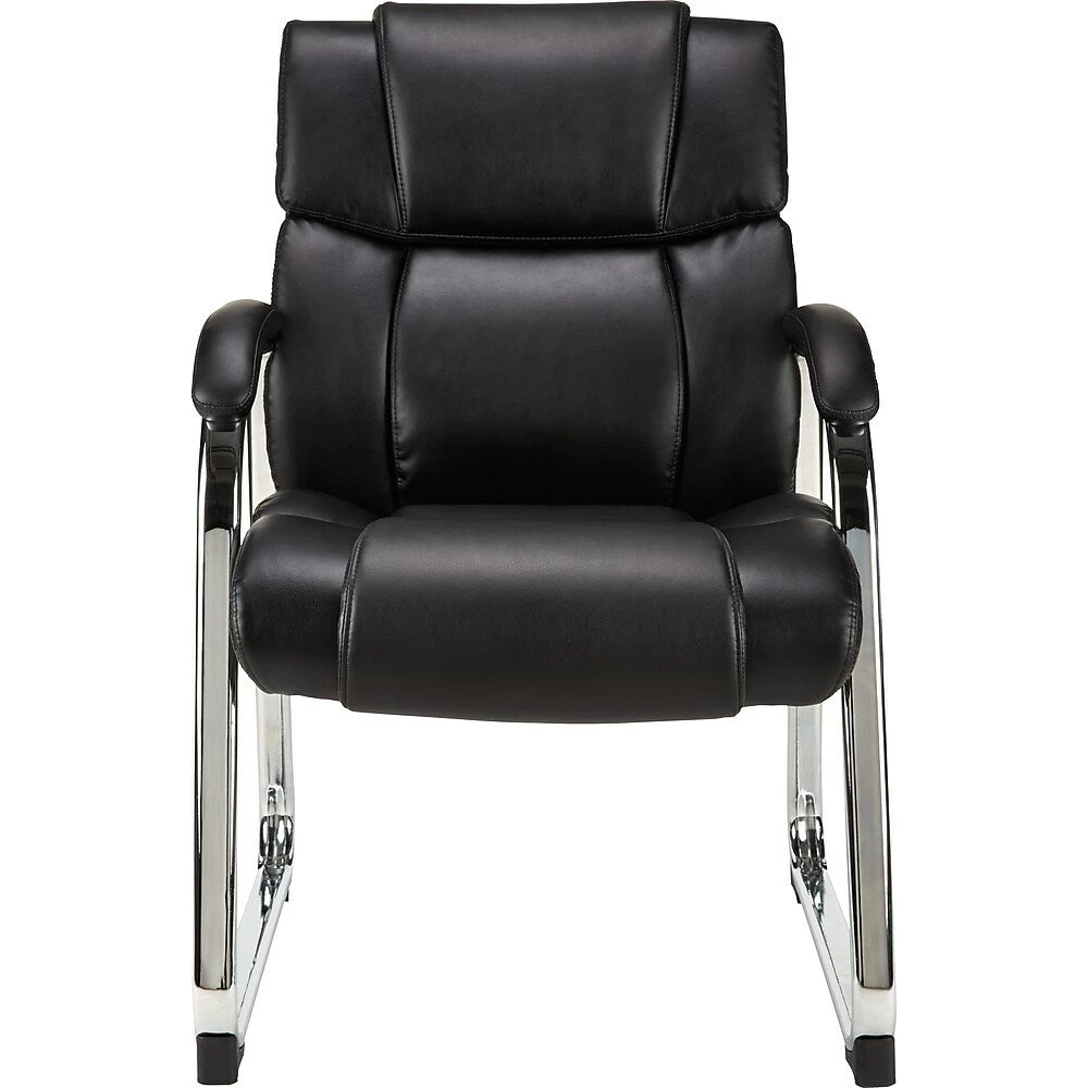 Maximize your guest seating with the stylish and comfortable Staples Sonada Bonded Leather Guest Chair. A padded seat and seat back and curved, padded armrests offer plush comfort and support. Bonded leather upholstery with polished chrome accents provide both durability and sleek style. A sled-style base offers stability, while integrated floor glides prevent scratches and scuffs. A practical choice, this guest chair brings convenience and comfort to your private office, reception area or lobby.
