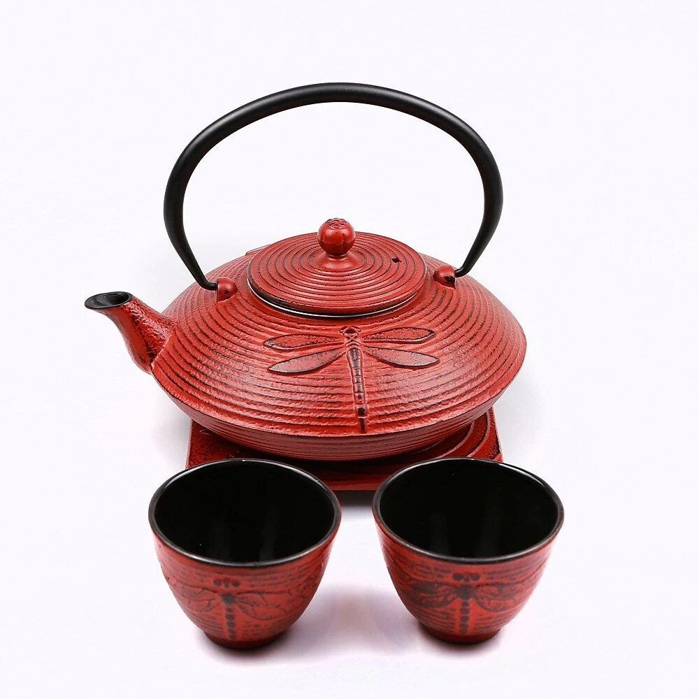 Tao Tea Leaf Large Cast Iron Tea Pot With Stand And 2 Cups, Loose Leaf, 0.8L, Red