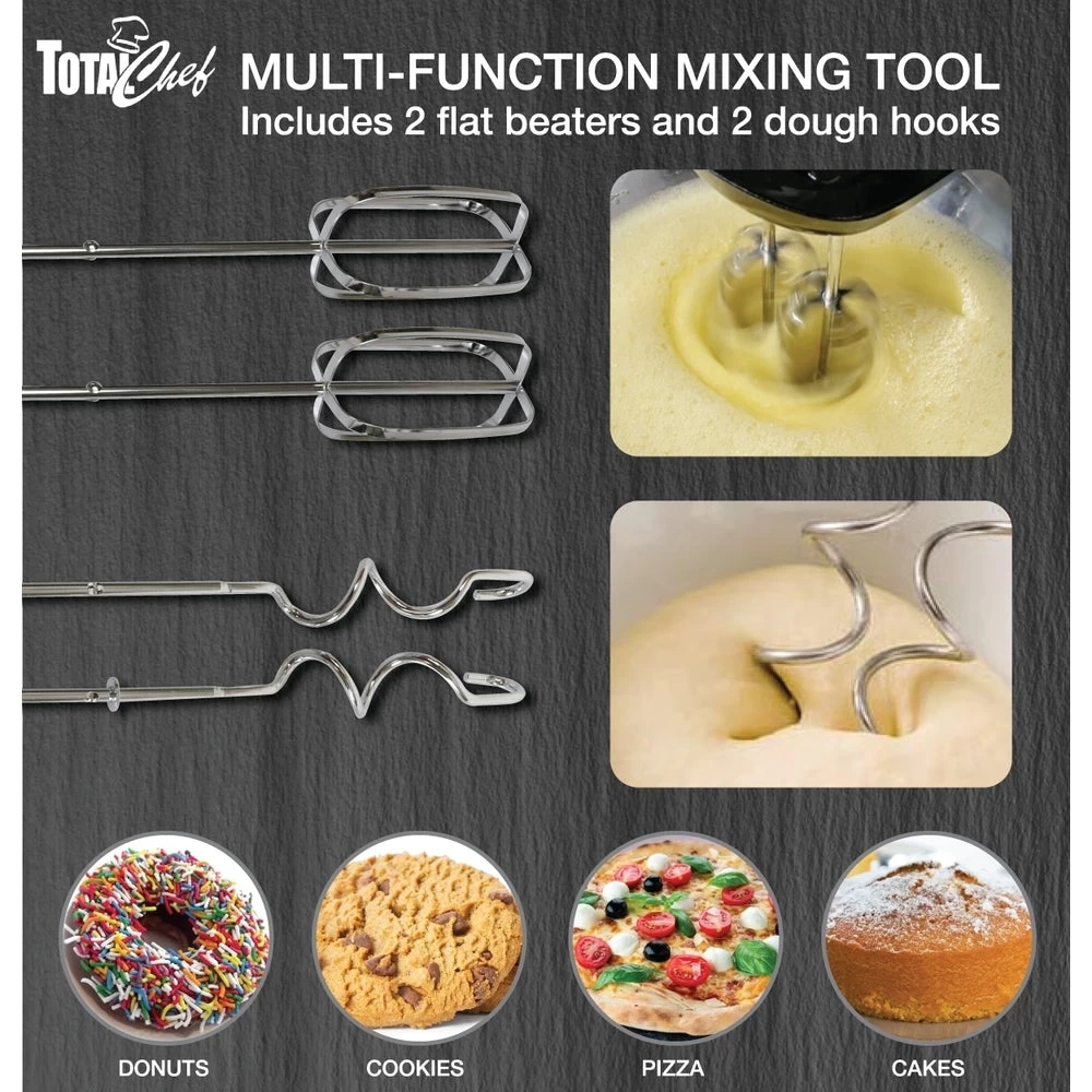 The Total Chef 6-Speed Hand Mixer is the ultimate kitchen tool to mix up doughs or batters for delicious cookies, cakes, muffins, bread, icing, whipped cream, and more.